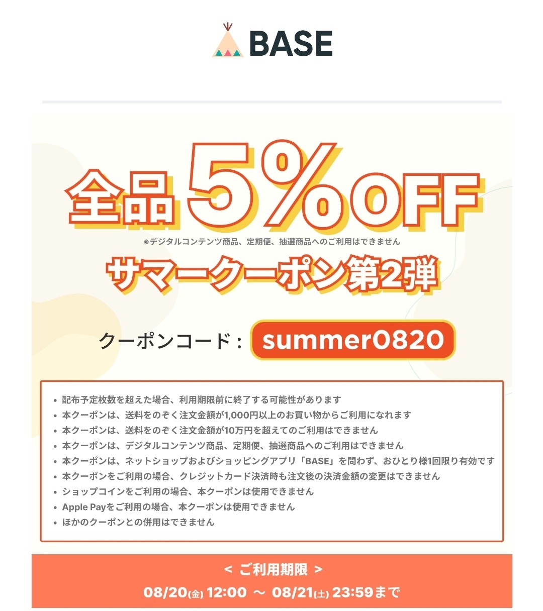 商品購入画面でクーポンコード≪summer0820≫を入力して下さい。