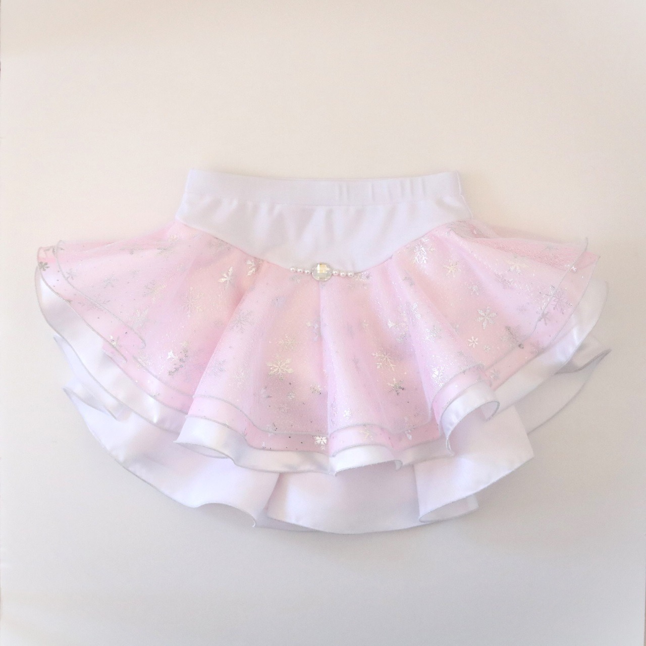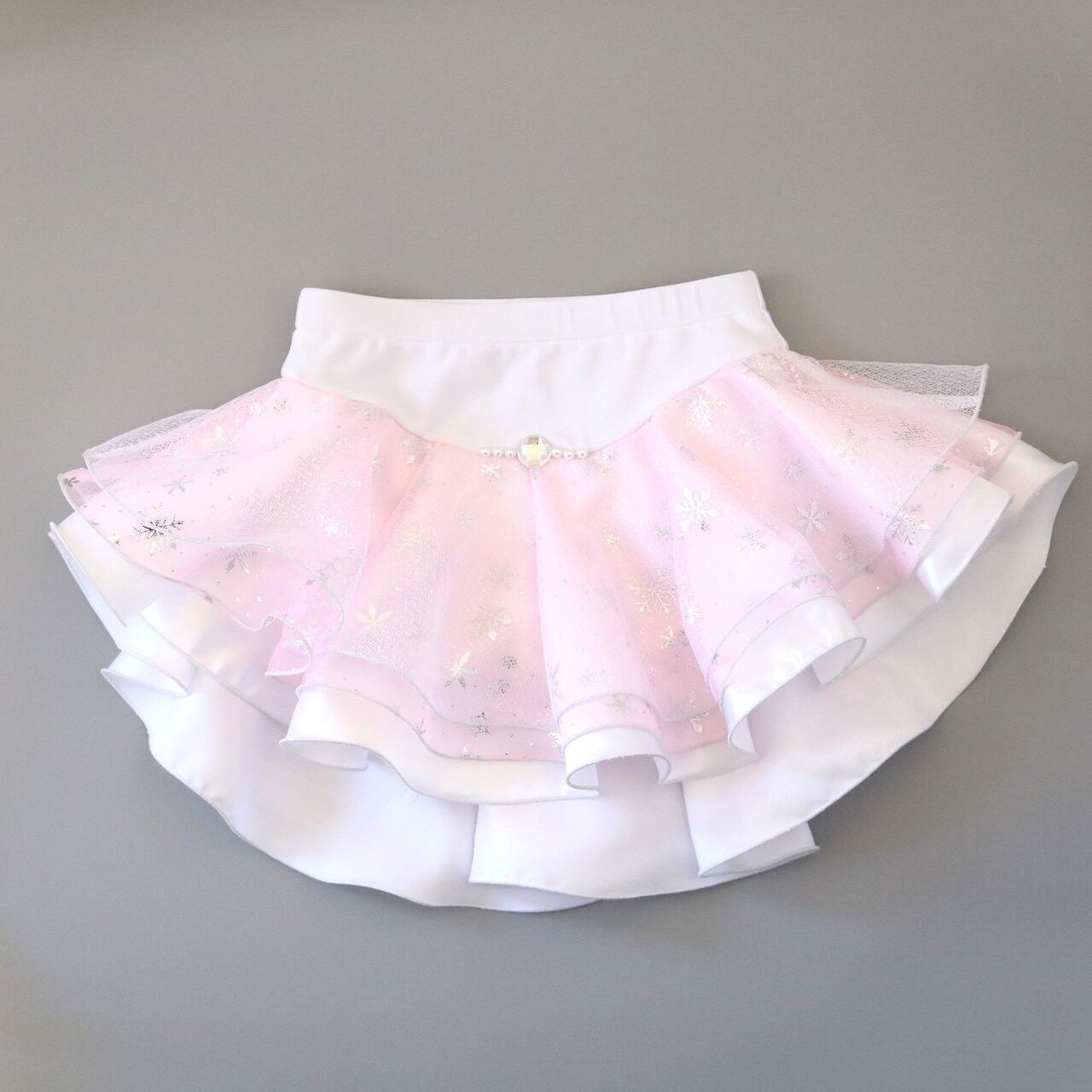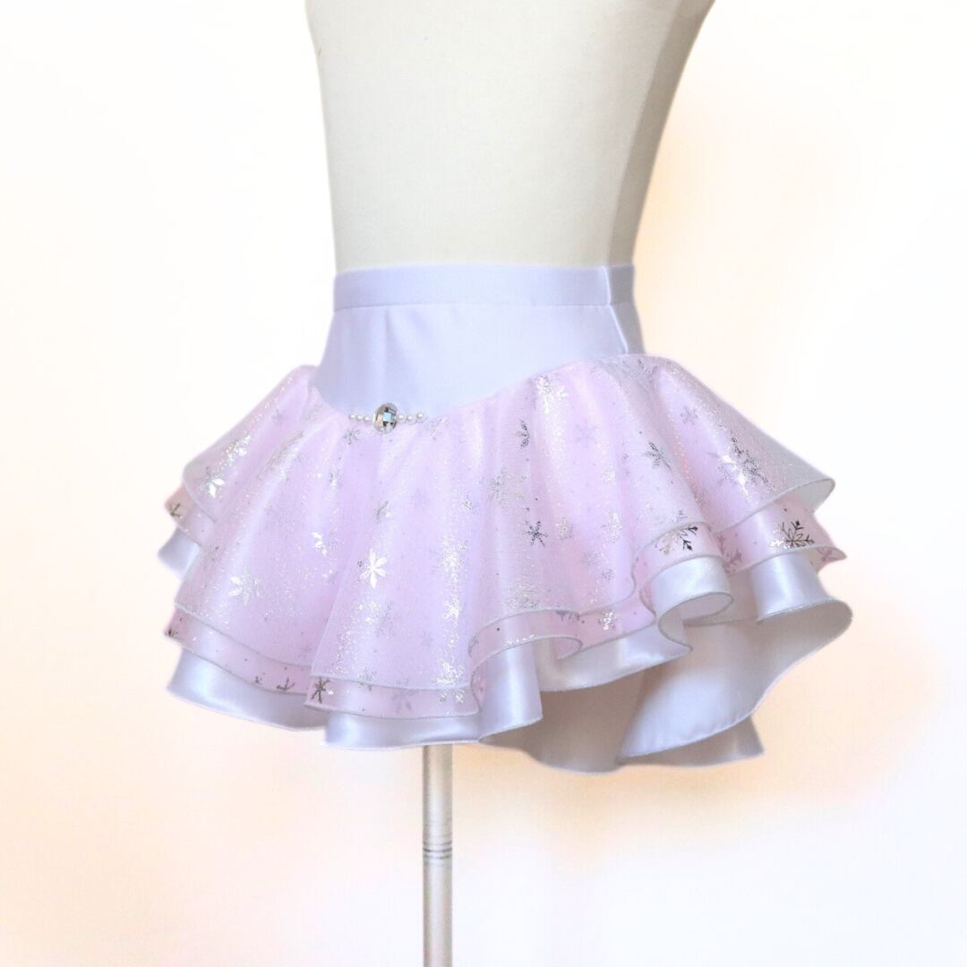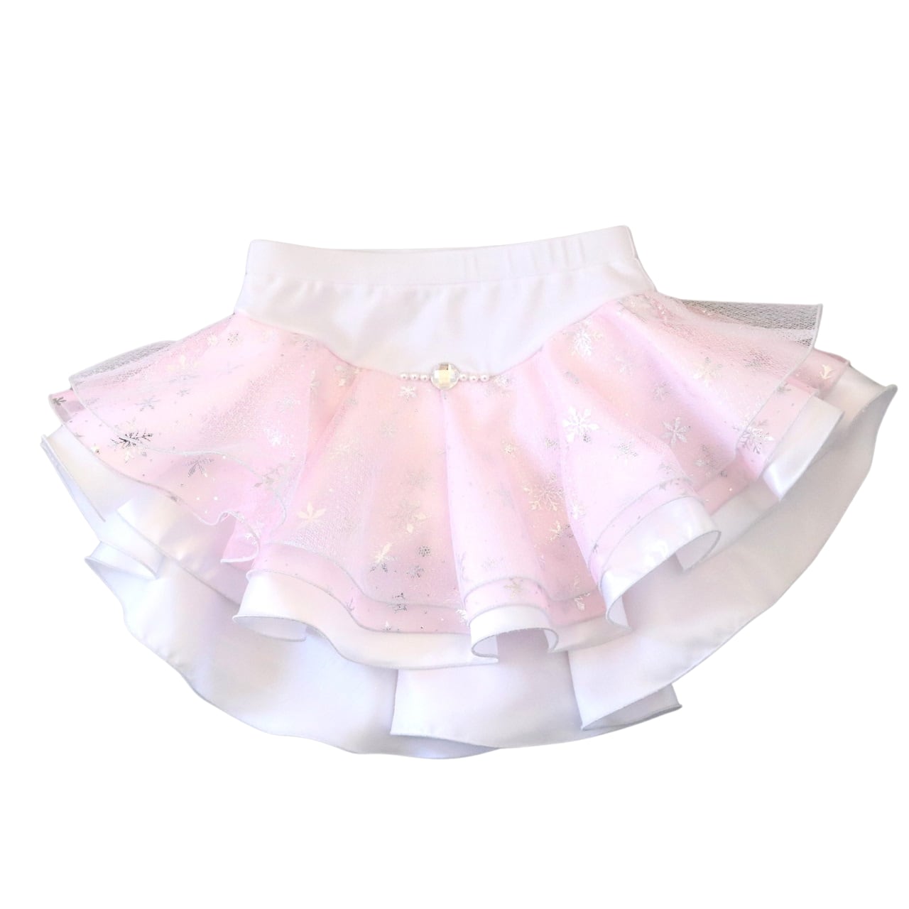 オーロラ糸が織り込まれたチュールと柔らかなパステルピンクの雪の結晶チュールが、華やかで可愛らしい雰囲気のフィギュアスケート用スカートです。