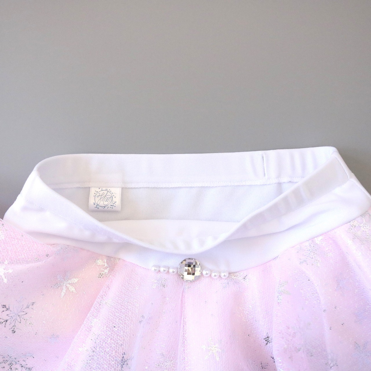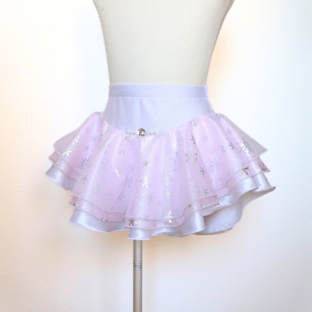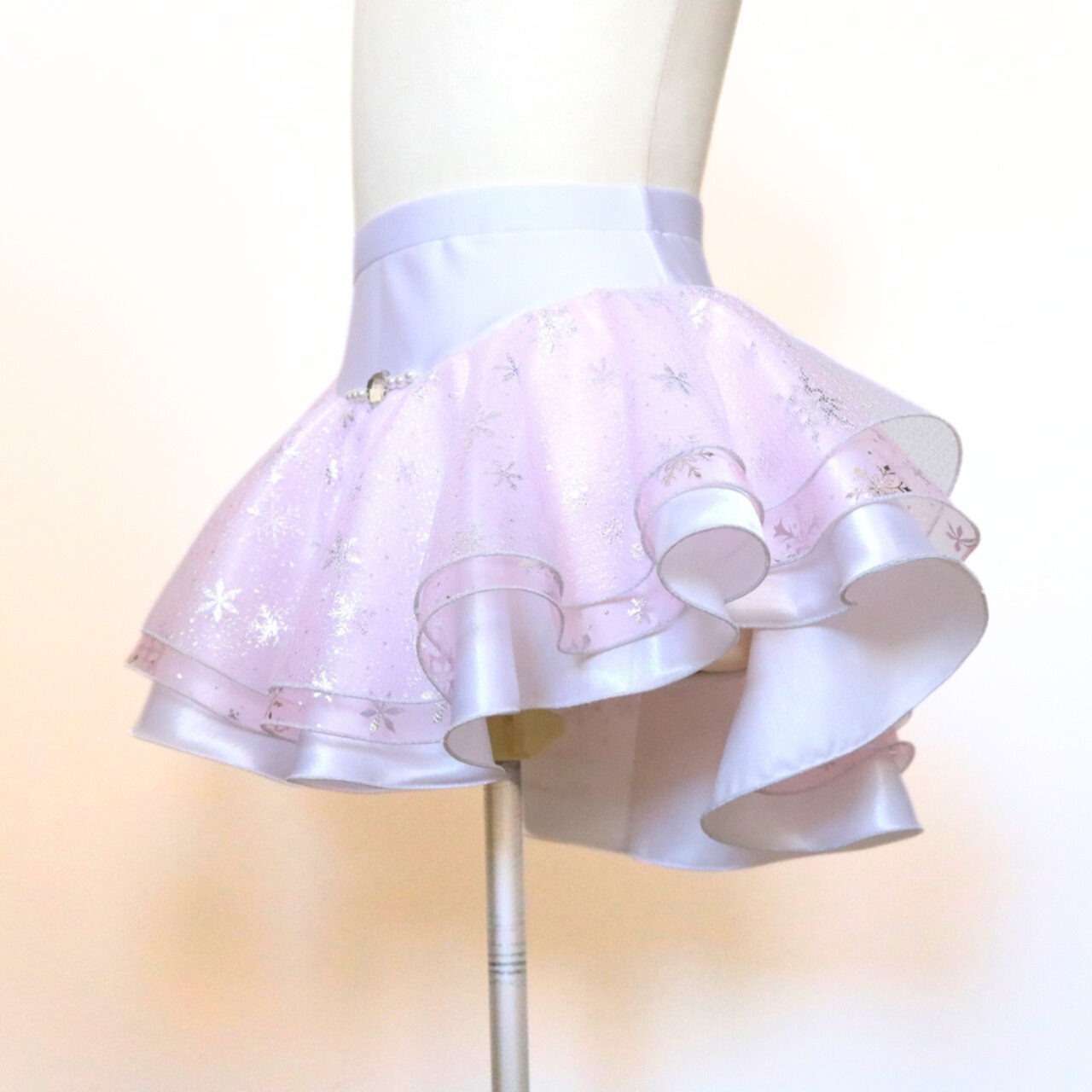 オーロラ糸が織り込まれたチュールと柔らかなパステルピンクの雪の結晶チュールが、華やかで可愛らしい雰囲気のフィギュアスケート用スカートです。