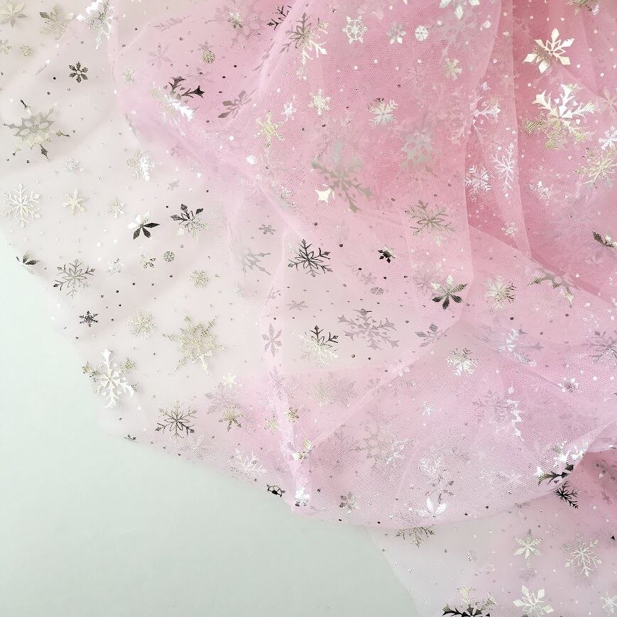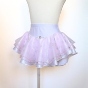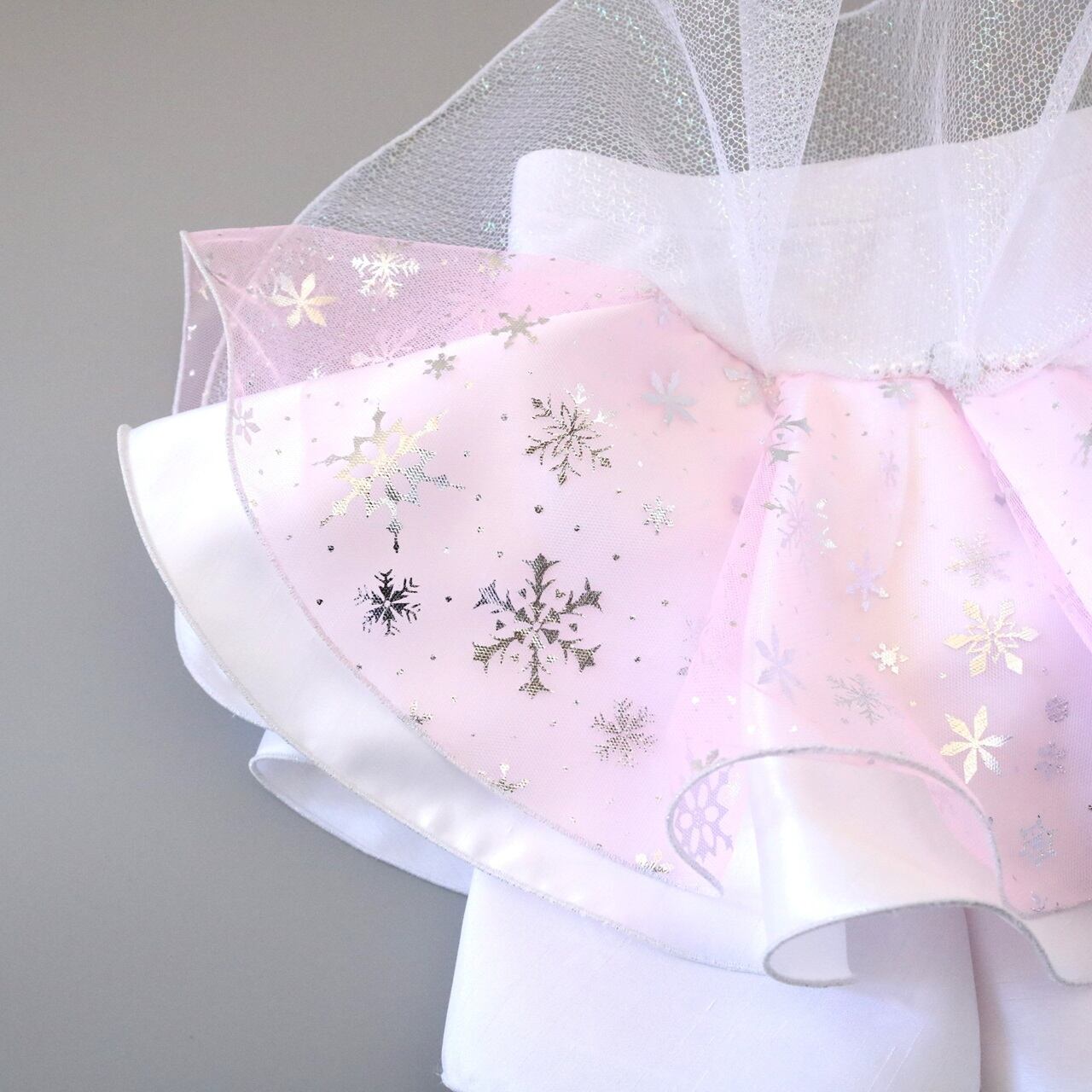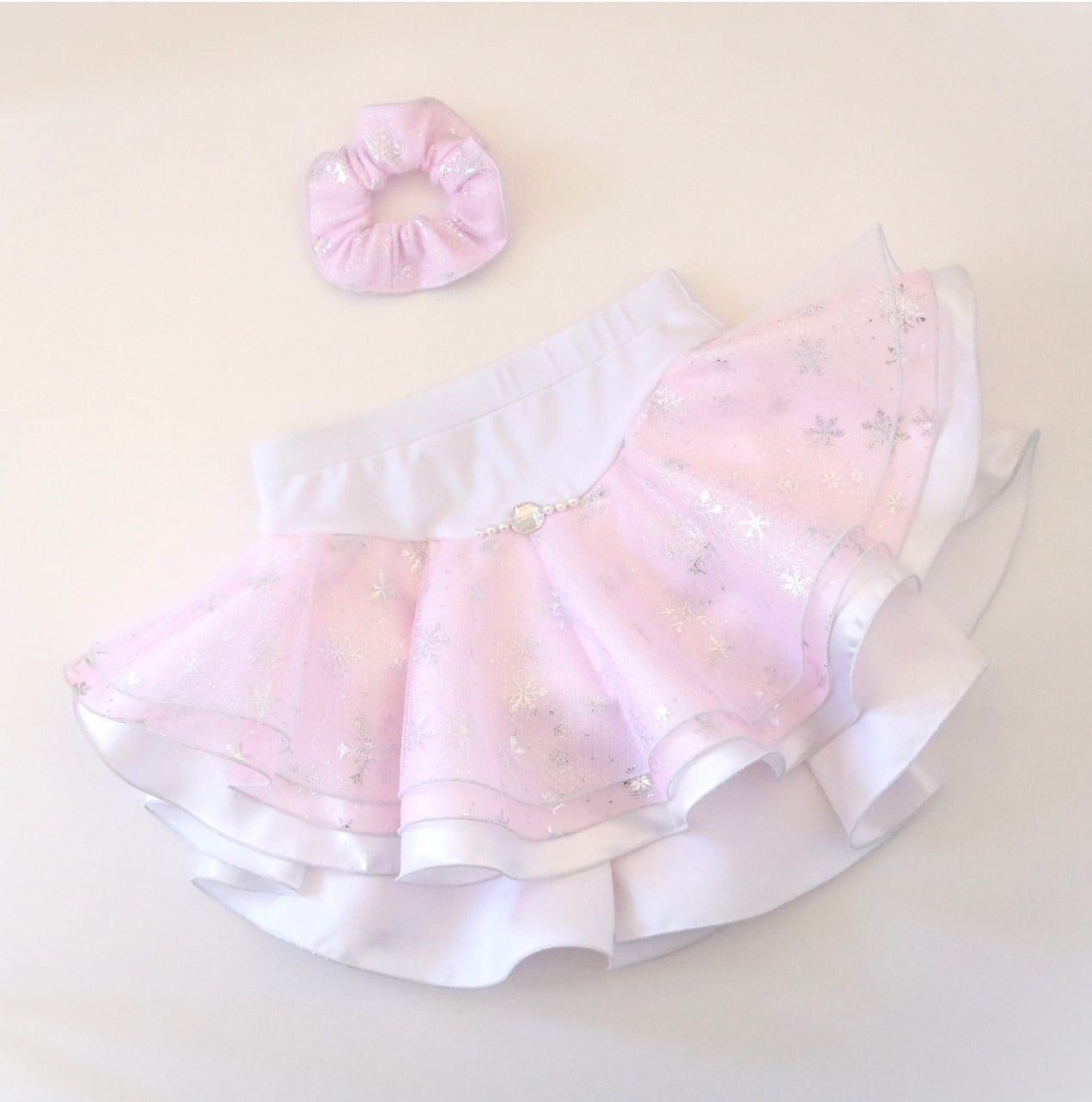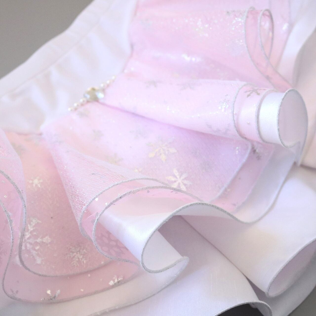 オーロラ糸が織り込まれたチュールと柔らかなパステルピンクの雪の結晶チュールが、華やかで可愛らしい雰囲気のフィギュアスケート用スカートです。