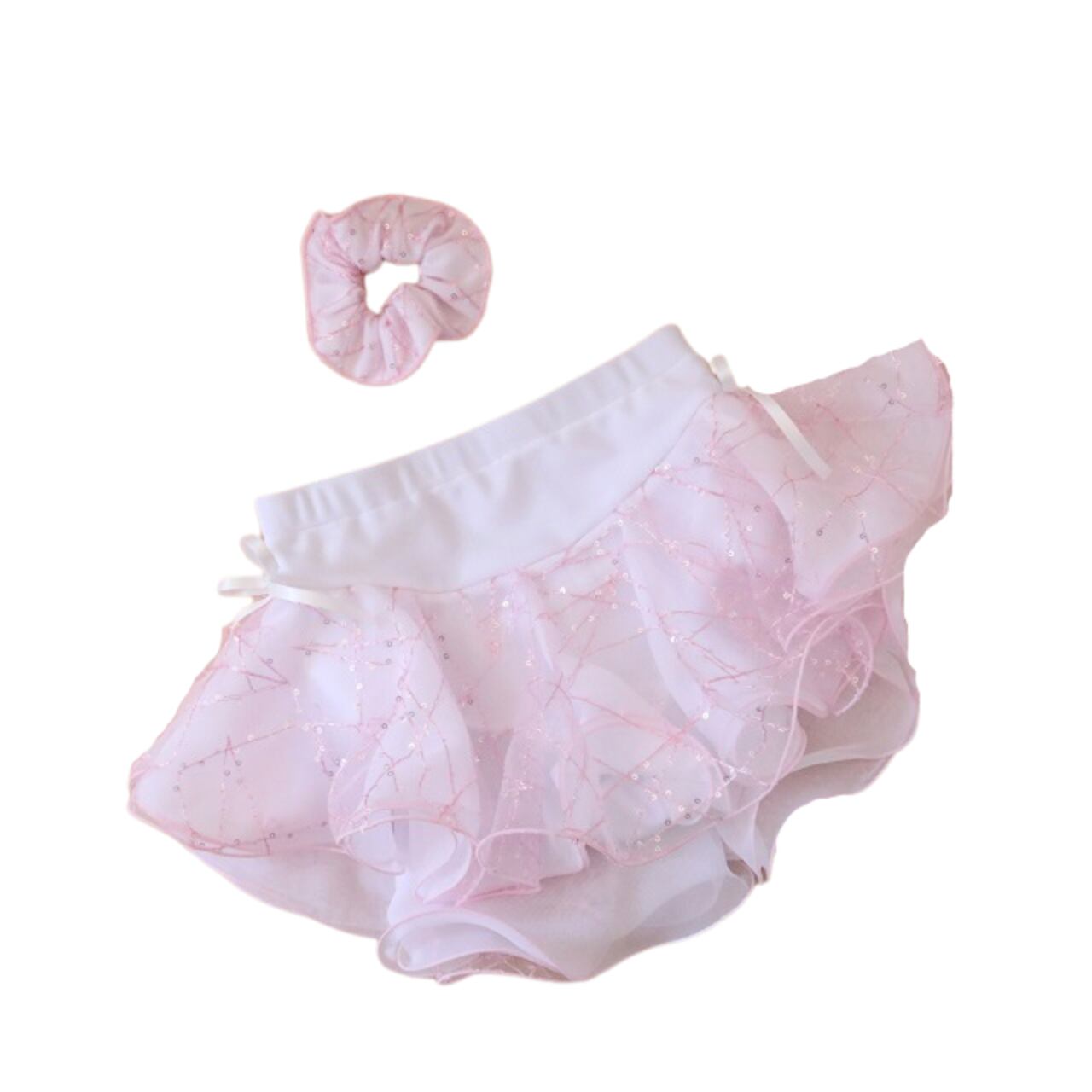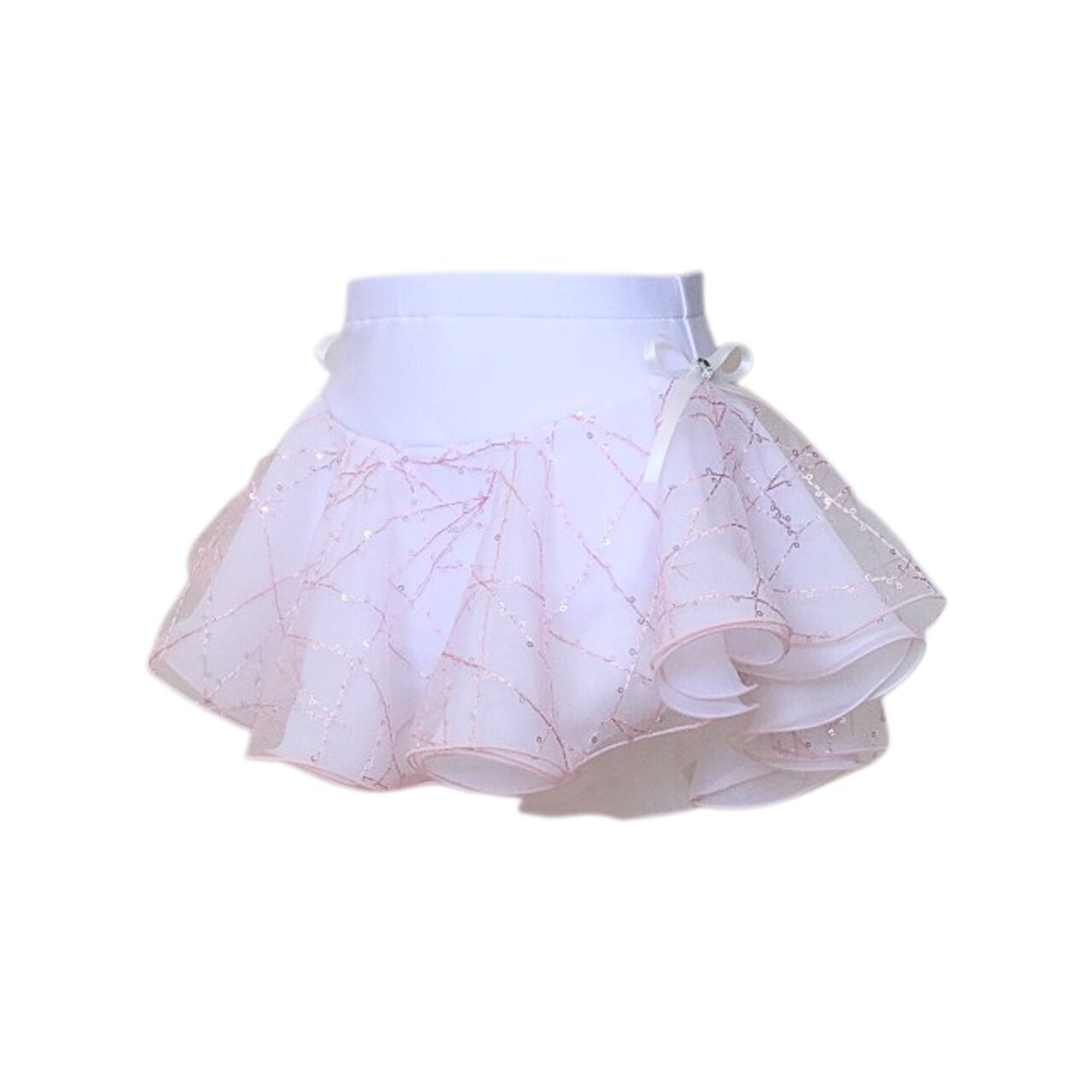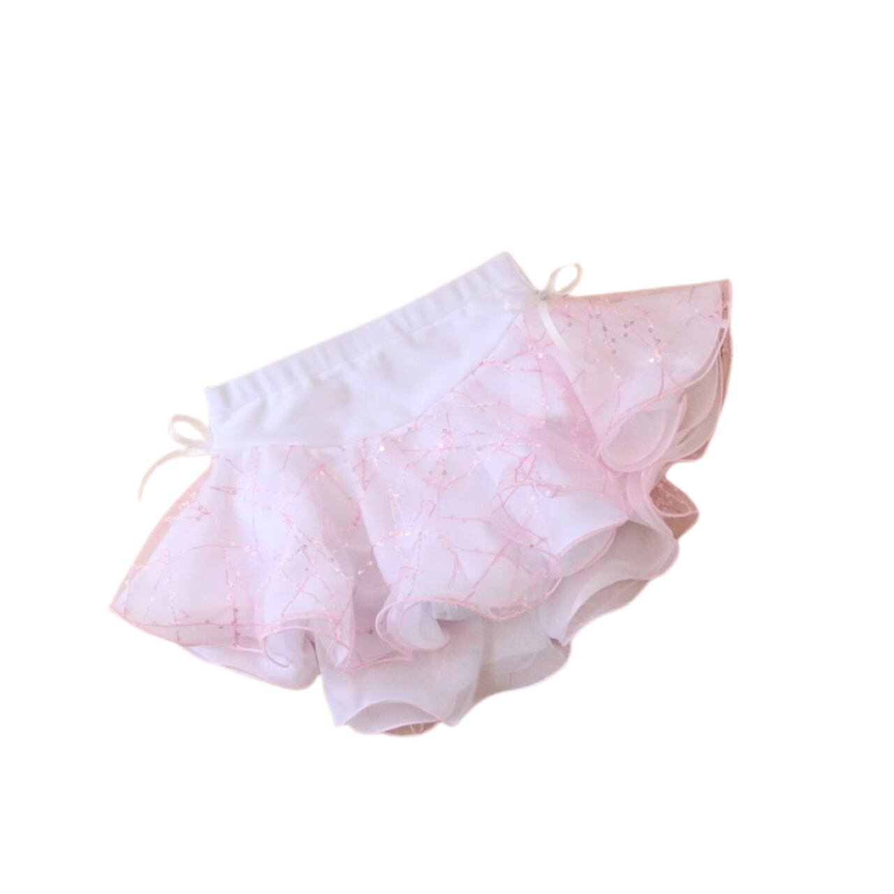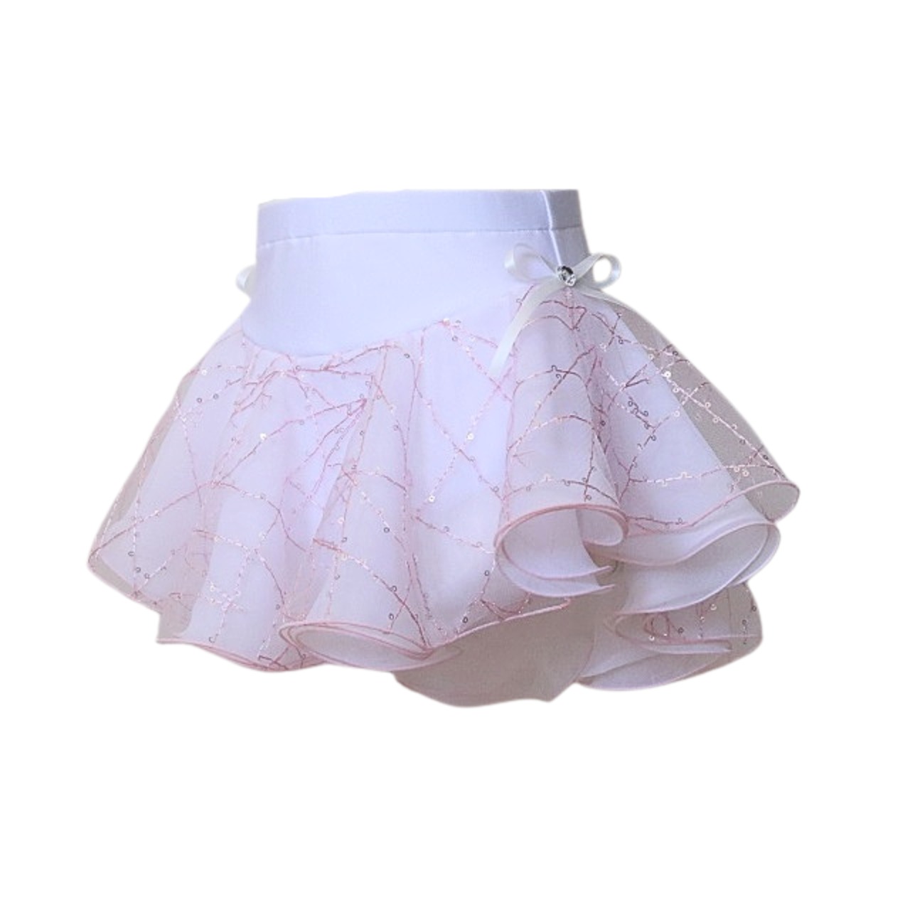 淡~いピンクに真っ白の柔らかジョーゼットを2段重ねた、見た目もふんわりな3段スカートです。 75デニールジョーゼットと薄いチュールのスカートなので、とっても軽くスケーティングのたびに、フワフワ揺れてとっても可愛いです。