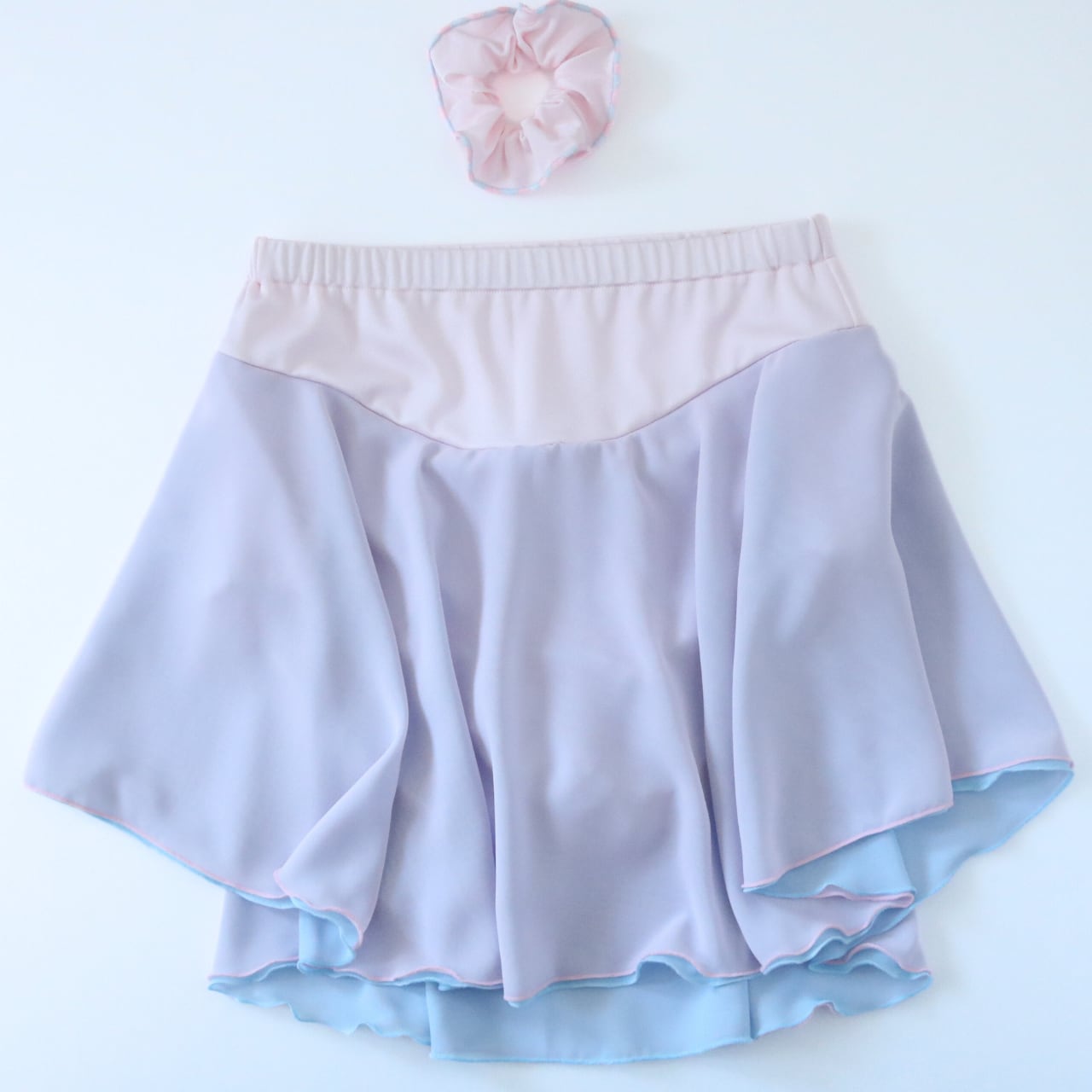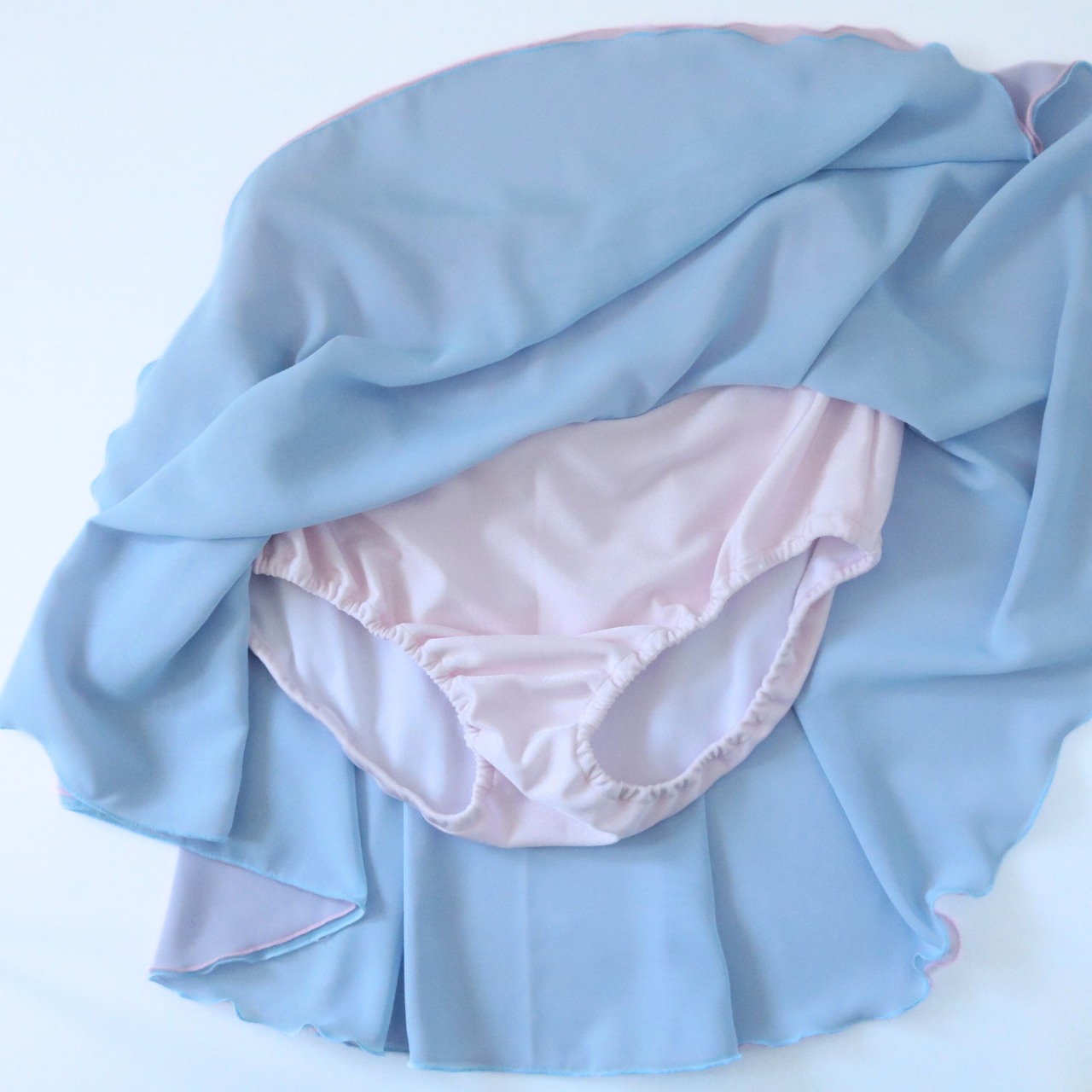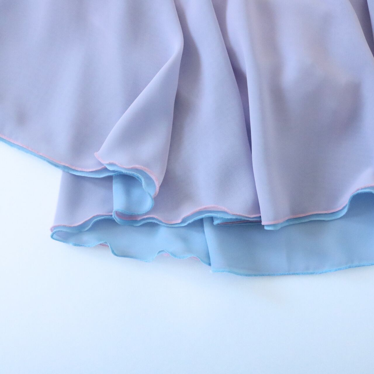 軽やかなジョーゼット素材でできたこちらのフィギュアスケート練習用スカートは、ヒラヒラ少なめのデザインで、サイドが短く後ろが少し長い、洗練されたシルエットが特徴です。